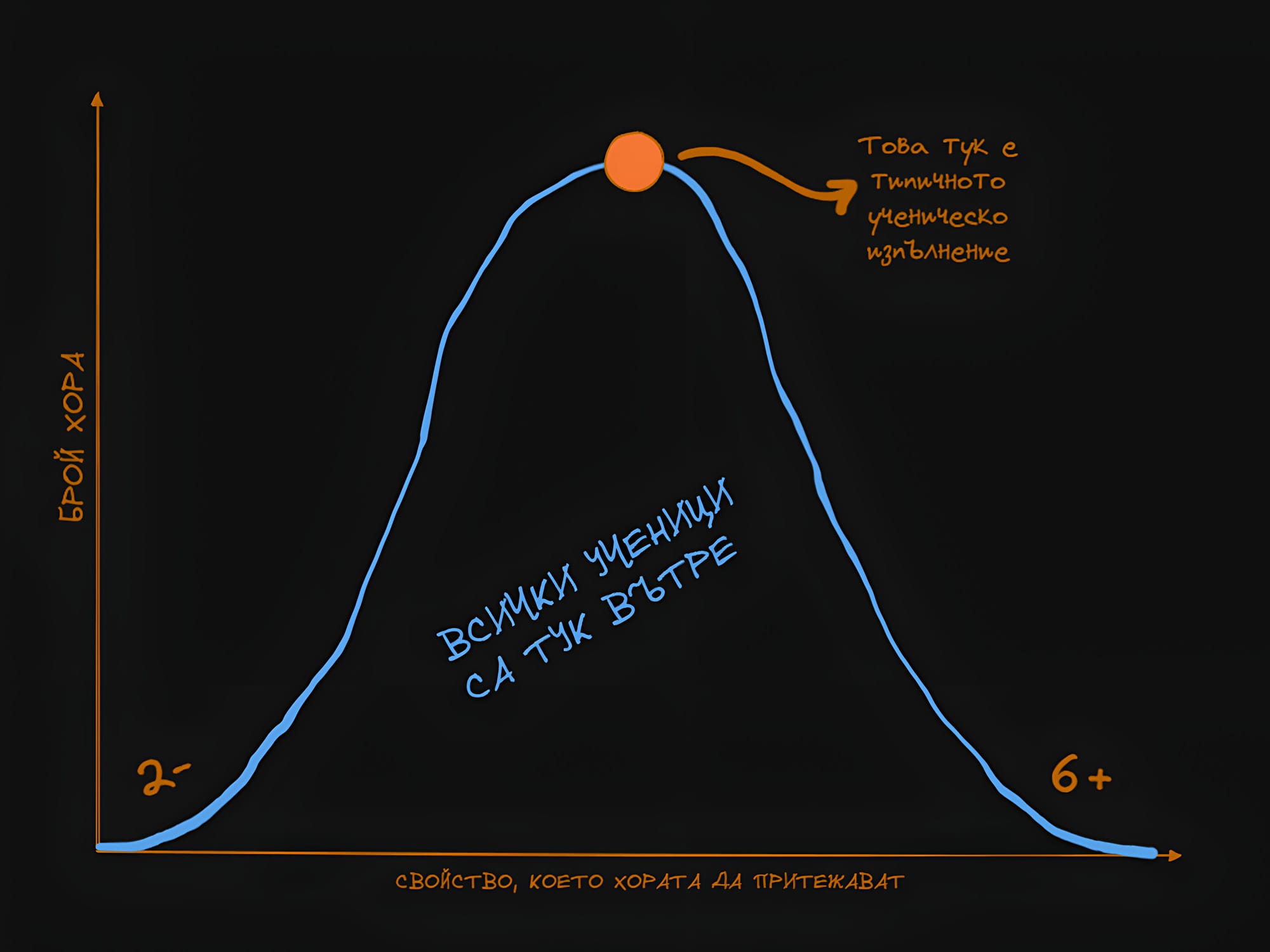 Тази графика е често срещана в различните типове науки, и е позната като “кривата на Гаус”, или още “камбановидната крива”. Под синята дъга са събрани всички членове на обществото (или поне тези от нашата извадка). Най-голям брой хора левитират около средата, и с отдалечаване от средата броят на тези хора намалява. Връщайки се на примера с учениците, това означава, че най-голям брой хора ще изкарат оценка 4, по-малък процент ще имат 3 и 5, и най-малък процент ще имат 2 и 6. Искам да обърна внимание, че тук става въпрос за това доколко реалните знания на учениците съвпадат с техните оценки (тъй като в България има склонност учителите изкуствено да завишават успеха, или пък учениците да мамят, за да изкарат по-висока оценка). Ако всичко е честно и обективно, разпределението на знания в графиката би изглеждало по подобен начин.