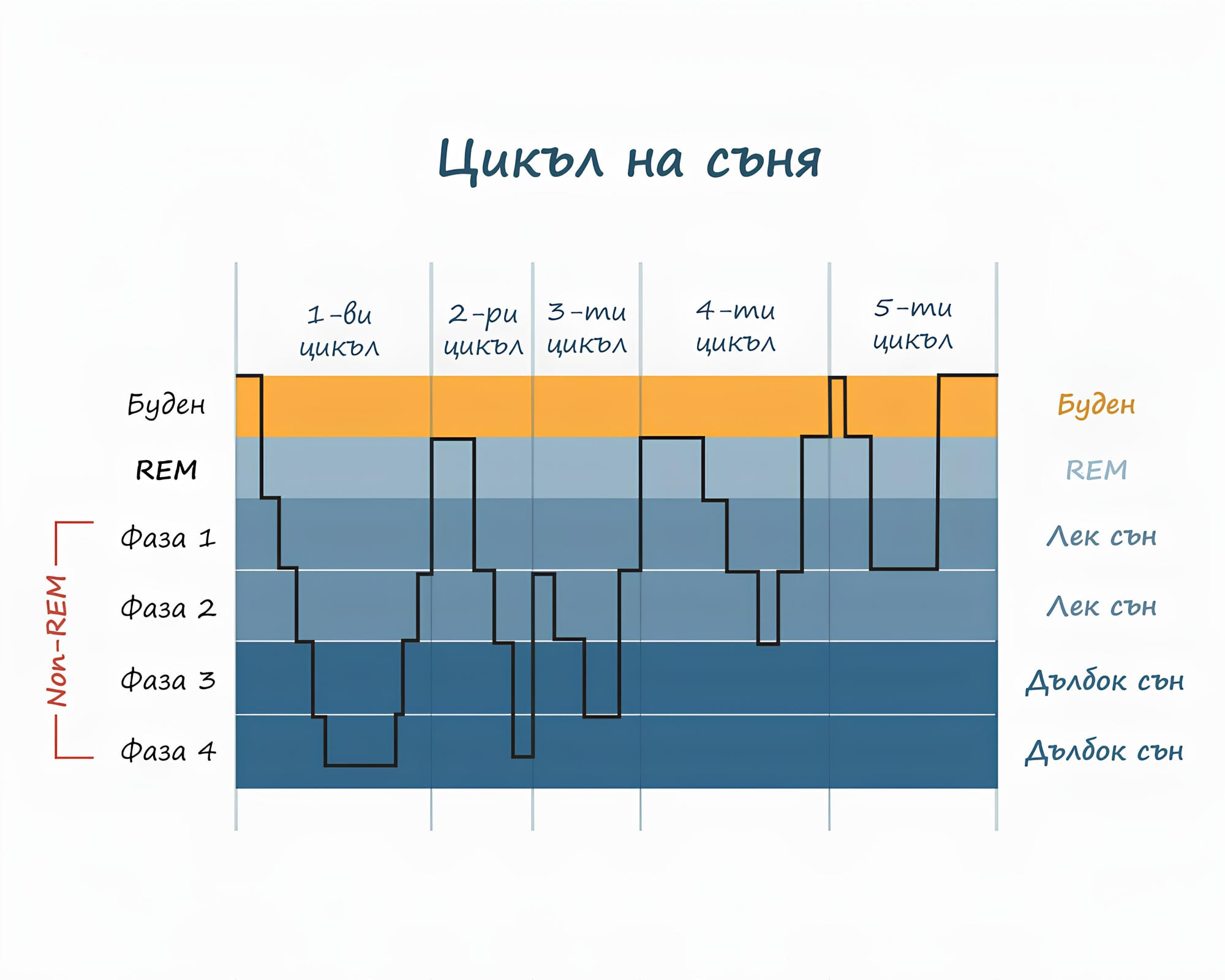 Сънят не е хомогенно състояние, а се състои от няколко ясно разграничими фази. Най-общо той се разделя на не-REM и REM сън. Не-REM сънят включва няколко етапа, които се характеризират с постепенно забавяне на мозъчната активност (варирайки от най-лек до най-дълбок етап и обратно, с един цикъл около 90 минути).